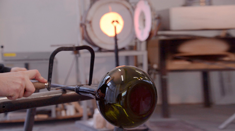 „Ich wusste nicht, ob man eine industriell gefertigte Glasflasche erhitzen und verformen kann. Das hat mir Cornelius Réer gezeigt. Er hat seine eigene Werkstatt und seine eigenen Kollektionen als Glasbläser und Glasmacher, und er ist ein sehr offener Mensch. Er hat sich bereit erklärt, mit mir die Prototypen zu erarbeiten. Dabei sind Produkte entstanden, die mir und vielleicht auch ihm als Handwerker nicht einfach so eingefallen wären.“