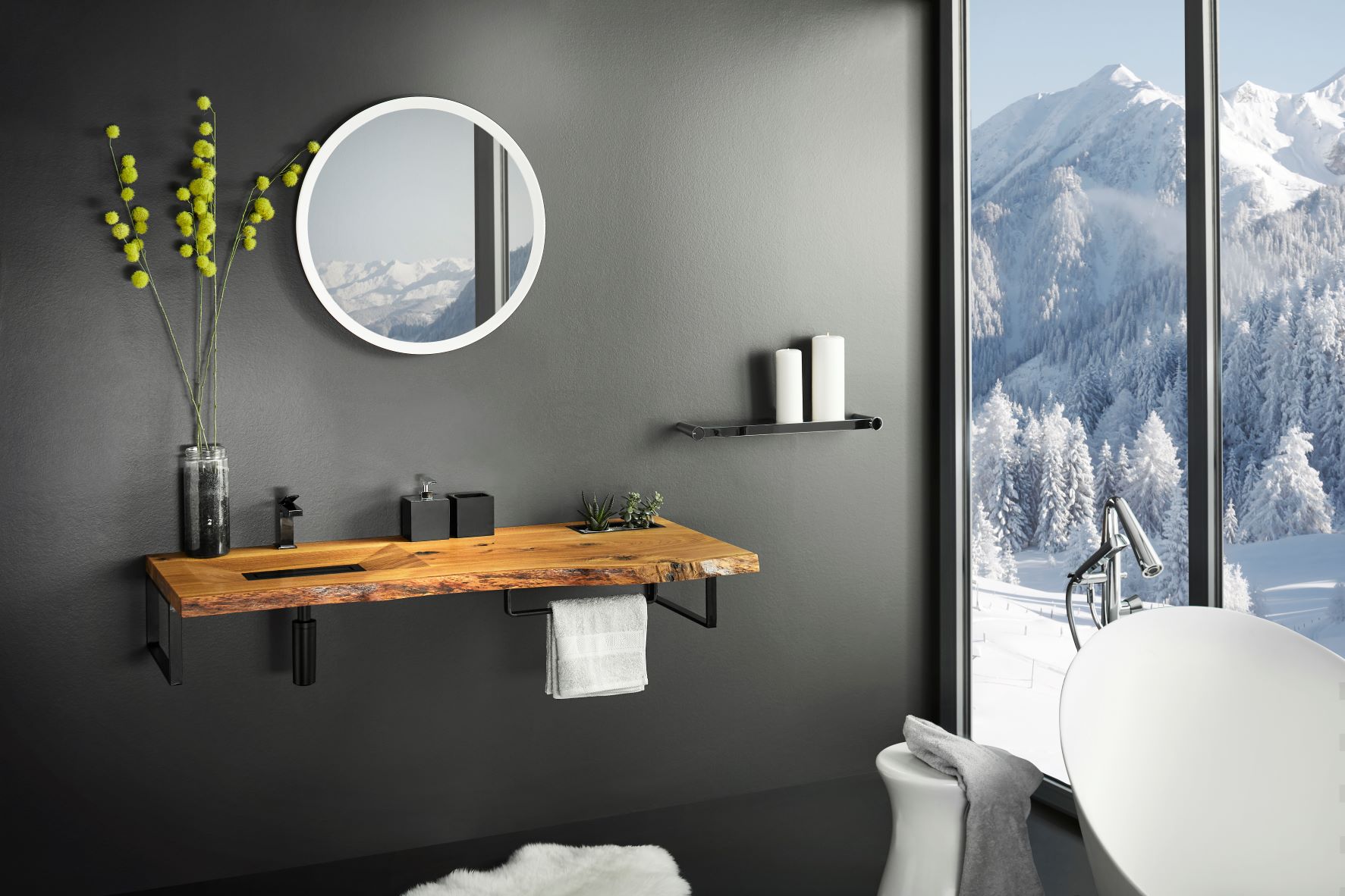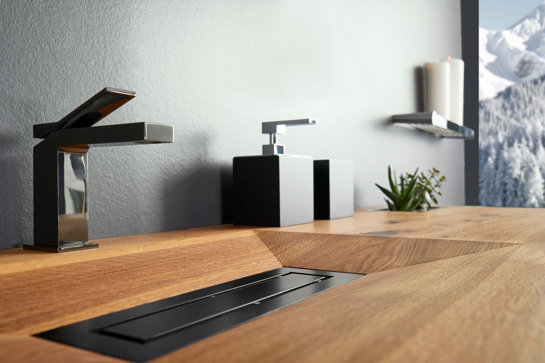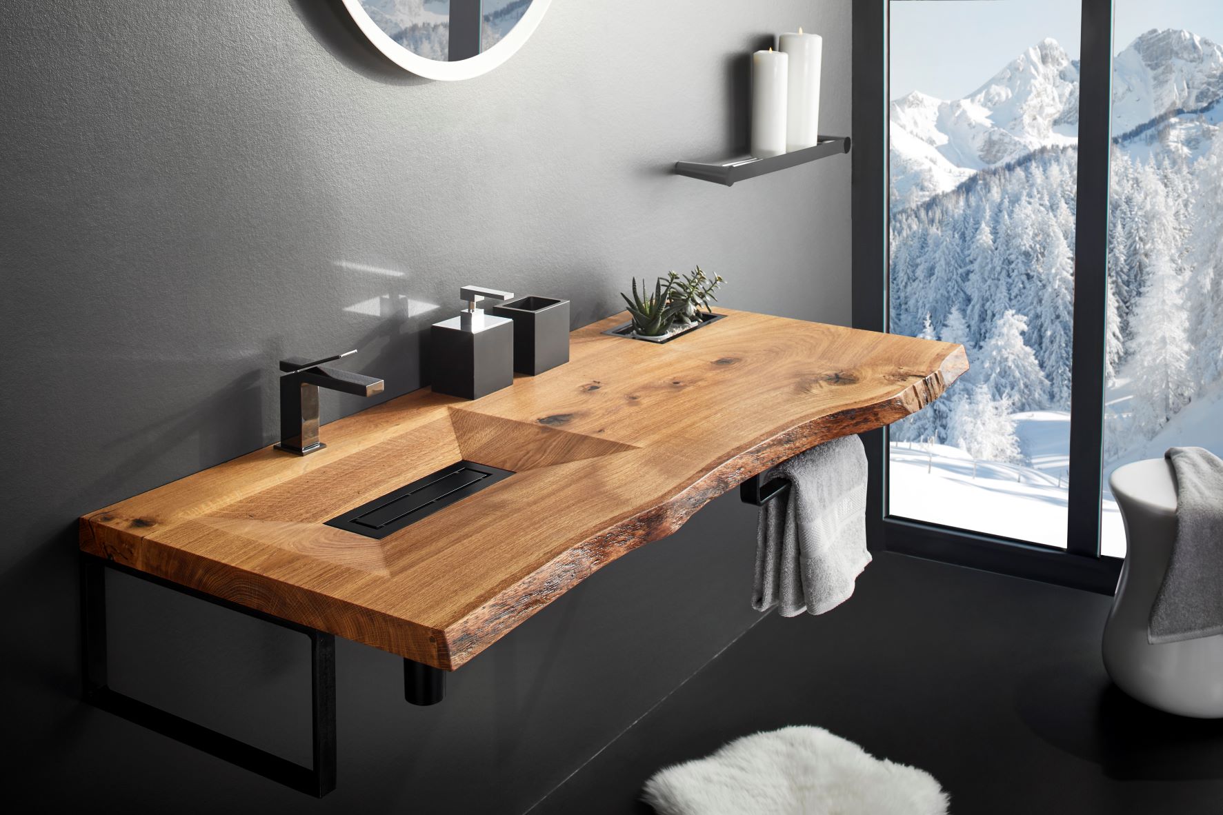Individualität steht bei Woodbasin an oberster Stelle. Heiko Neumann bietet seinen Kunden eine große Auswahl an Gestaltungsmöglichkeiten. Das geht von individuellen Fräsungen und Einlagen aus Glas, LED, Metall oder Stein bis zu Einlegern für Pflanzen, Unterschränken, Handtuchhalterungen, Spiegeln und praktischem Stauraum für Handtücher und Badprodukte. Die Waschtische stellt Neumann auf Wunsch auch in Sondergrößen bis zu 6000 mm × 1500 mm × 240 mm her – und keilgezinkt geht es sogar noch ein bisschen größer. „Für hohe Langlebigkeit behandeln wir die Oberflächen mit einem besonders haltbaren Speziallack. Und wenn es einmal doch hart auf hart kommt, können Macken auch herausgeschliffen werden“, erklärt Neumann. Das Preisspektrum der Tische beginnt bei ca. 550 Euro für das kleine Cone Quadra (ab 42 cm × 31 cm) und reicht – Sondergrößen ausgenommen – bis etwa 4.000 Euro für den Design-Gewinner Cone Invi. Und nicht zu vergessen: Bei der Herstellung jedes Waschtisches werden rund 750 Kilogramm Kohlendioxid neutralisiert.